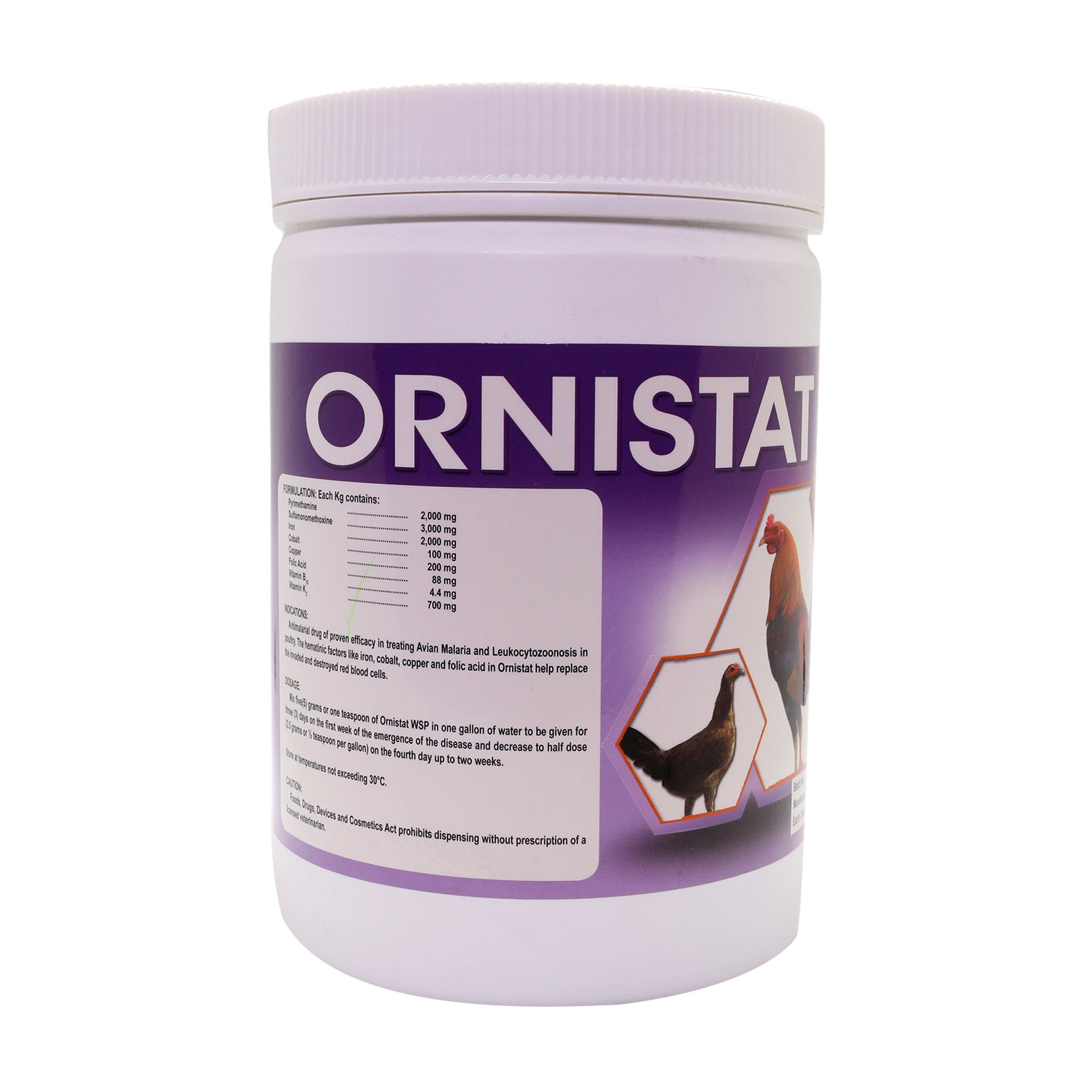 Antimalarial drug of proven efficacy in treating Avian Malaria and Leukocytozoonosis in poultry. The hematinic factors like iron, cobalt, copper, and folic acid in Omistat help replace the invaded and destroyed red blood cells.
